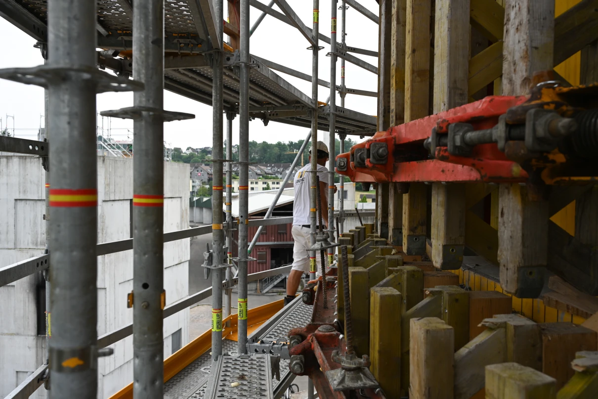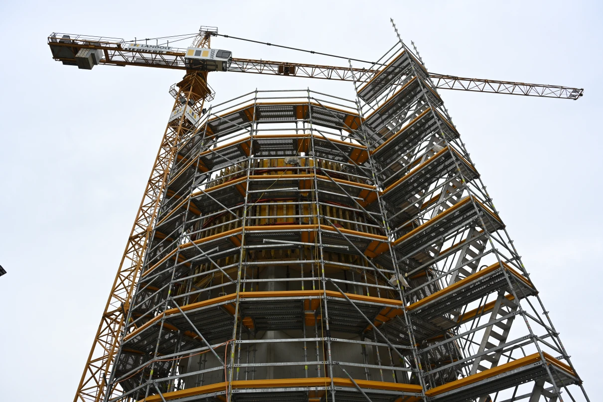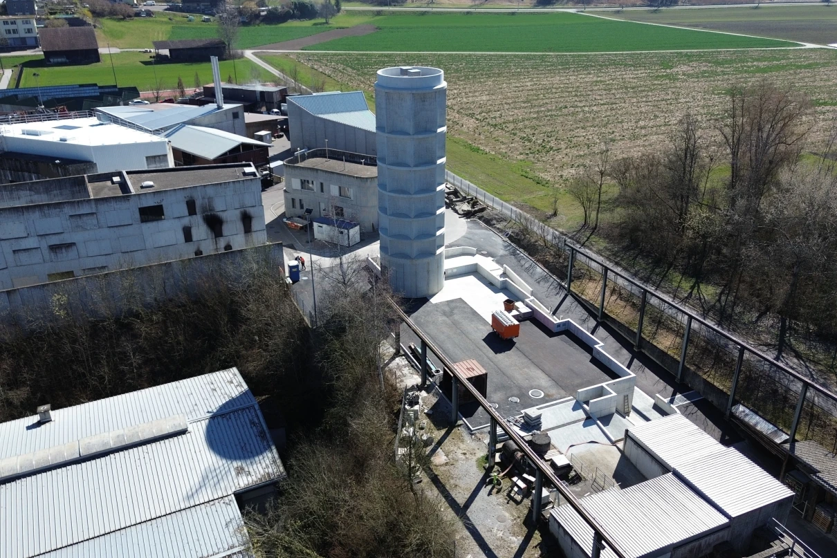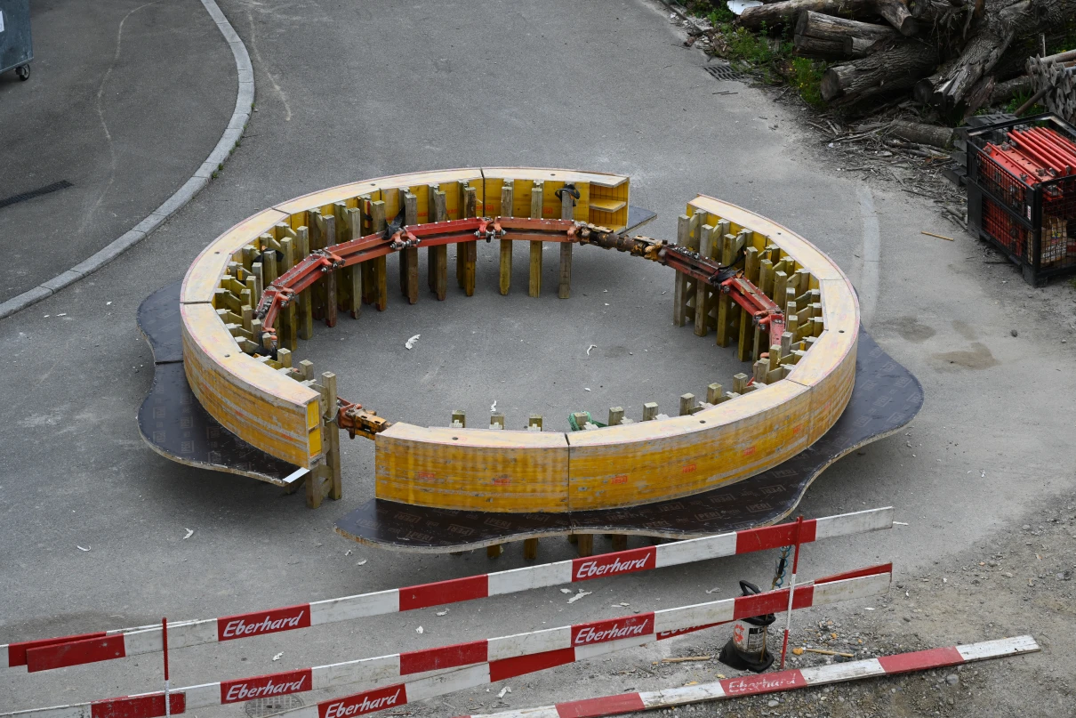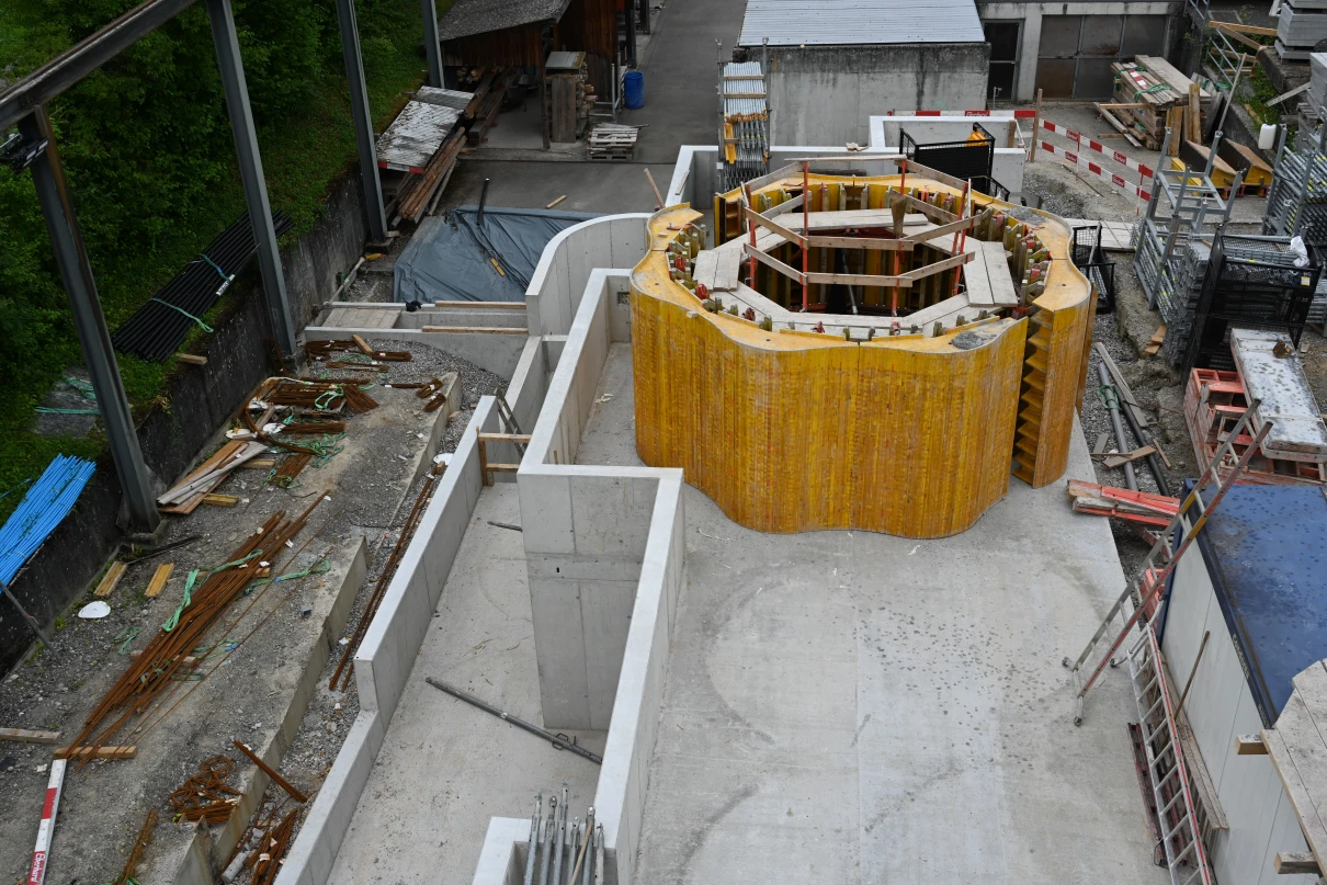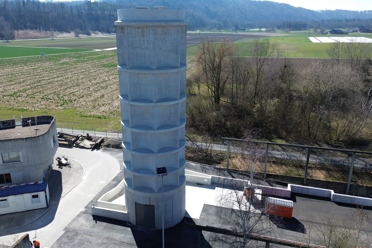 Für das Ausbildungszentrum Andelfingen bauen wir eine Flutungsanlage mit einem 23m hohen Wasserturm. Die Anlage wird genutzt um Ernstfälle rund ums Thema Überflutungen zu trainieren. 350 Kubikmeter Wasser kann der Turm fassen, um die fünf Kammern, sowie die Rampe zu fluten. Mit komplexen Pumpsystem wird das Wasser nach Beendung der Übung wieder zurück in den Turm gepumpt. Um der anspruchsvollen Geometrie des Wasserturms gerecht zu werden, wurde ein Schalungskonzept in Zusammenarbeit mit Peri AG ausgearbeitet.
