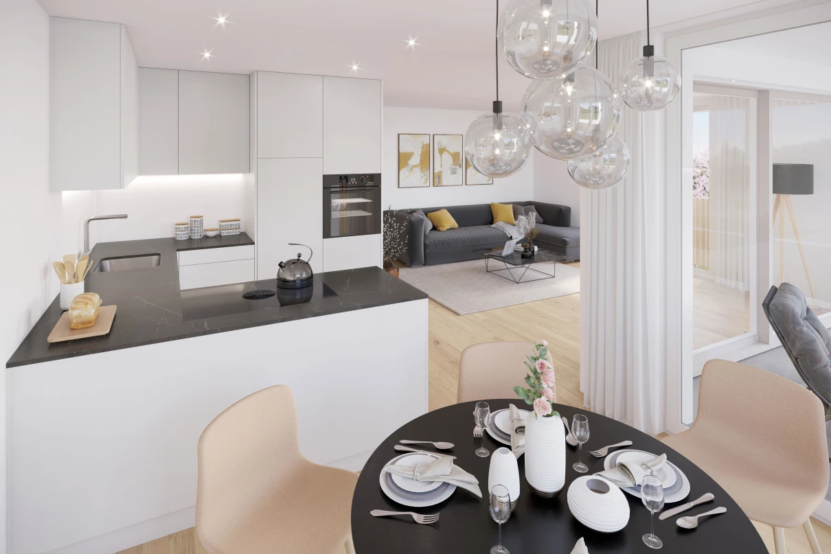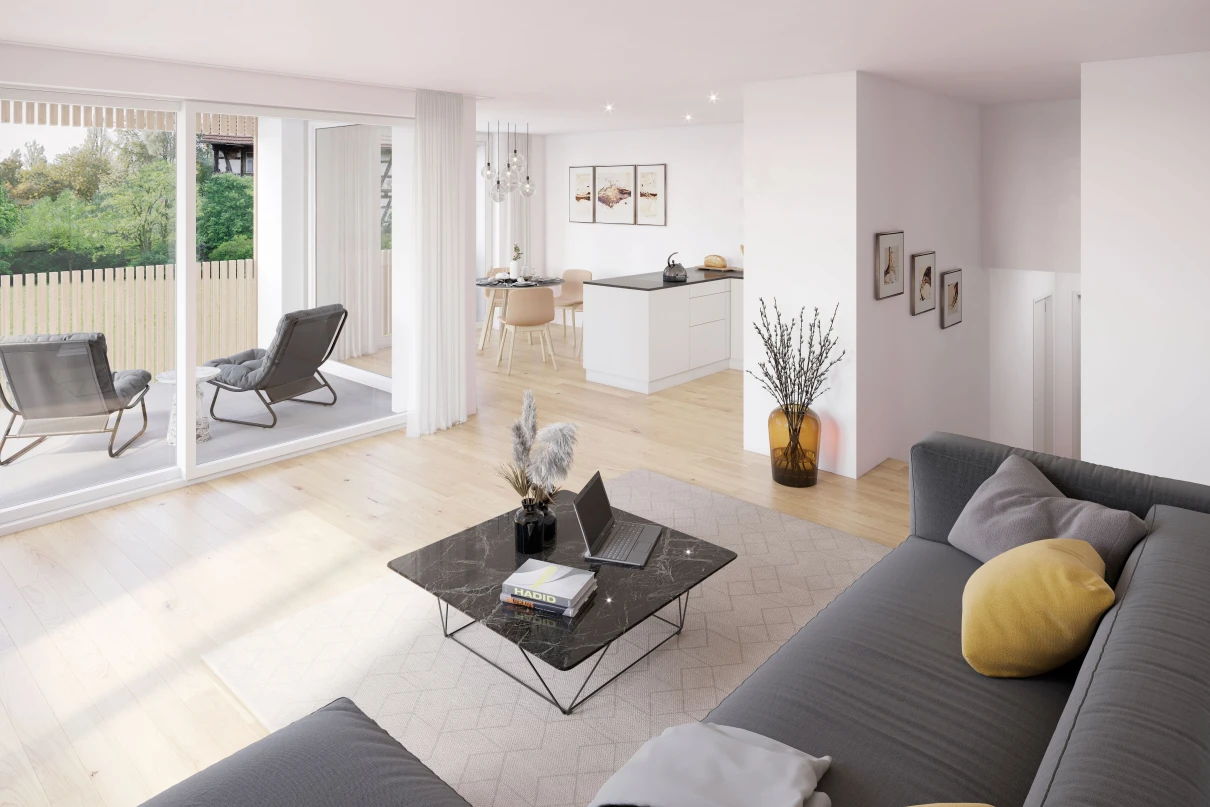 In einem stilvollen Anbau an ein früheres Dorfrestaurant entsteht diese moderne 4.5-Zimmer-Wohnung. Ein gelungener Mix aus ländlichem Charakter und zeitgemässem Wohnkomfort.