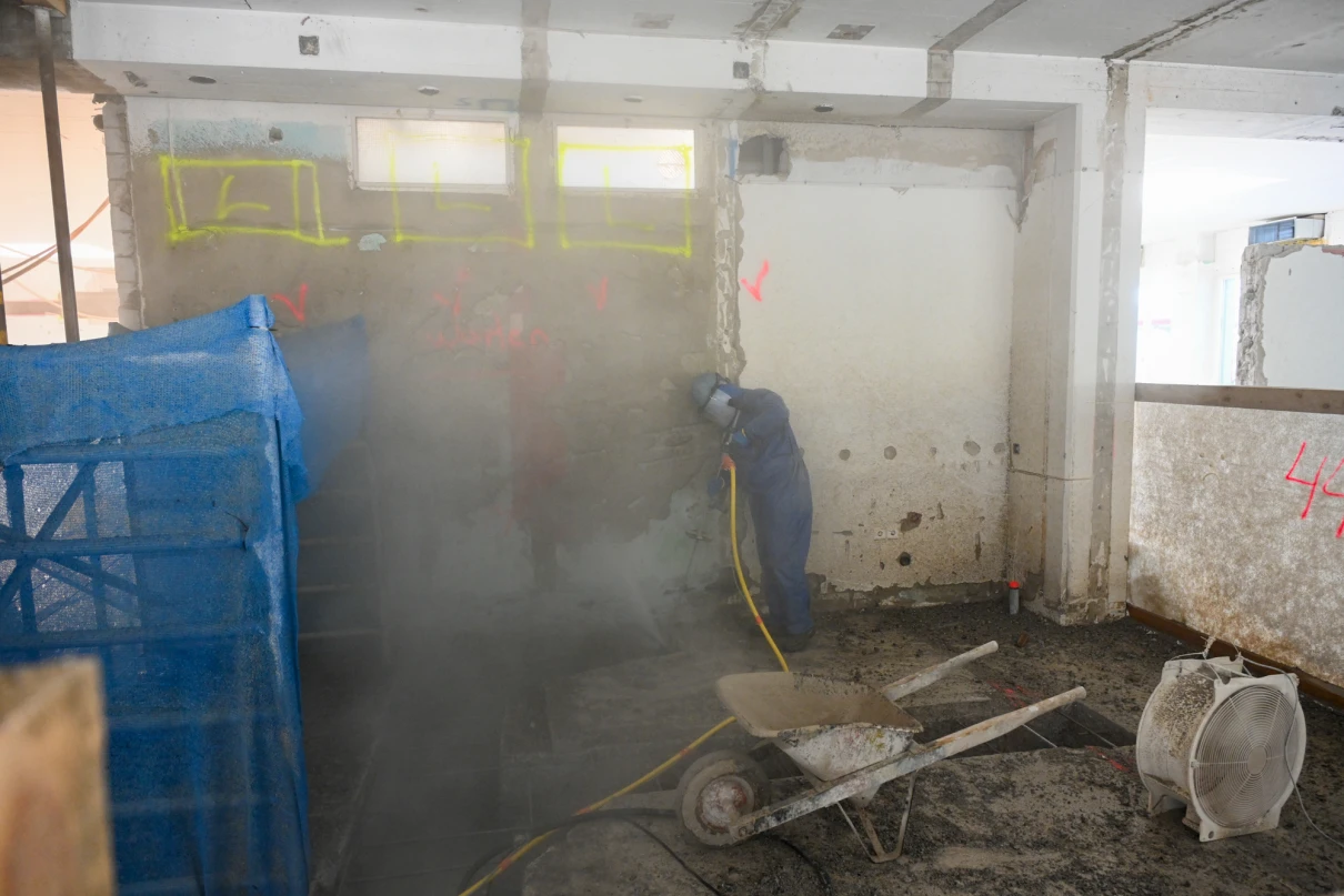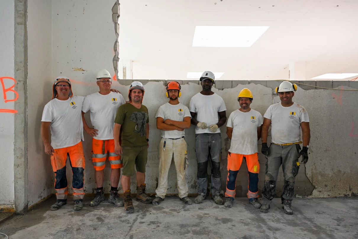 Unser Leistungsumfang umfasst das Erstellen von Bodenschlitzen in der bis zu 60 cm starken Bodenplatte mittels Hochdruckwasserstrahltechnik (HDW), diverse Maurerarbeiten sowie statische Verstärkungen durch den Einbau vorfabrizierter Beton- und Stahlstützen. Zusätzlich führen wir die Ortbetonarbeiten für die neuen Liftschächte aus.